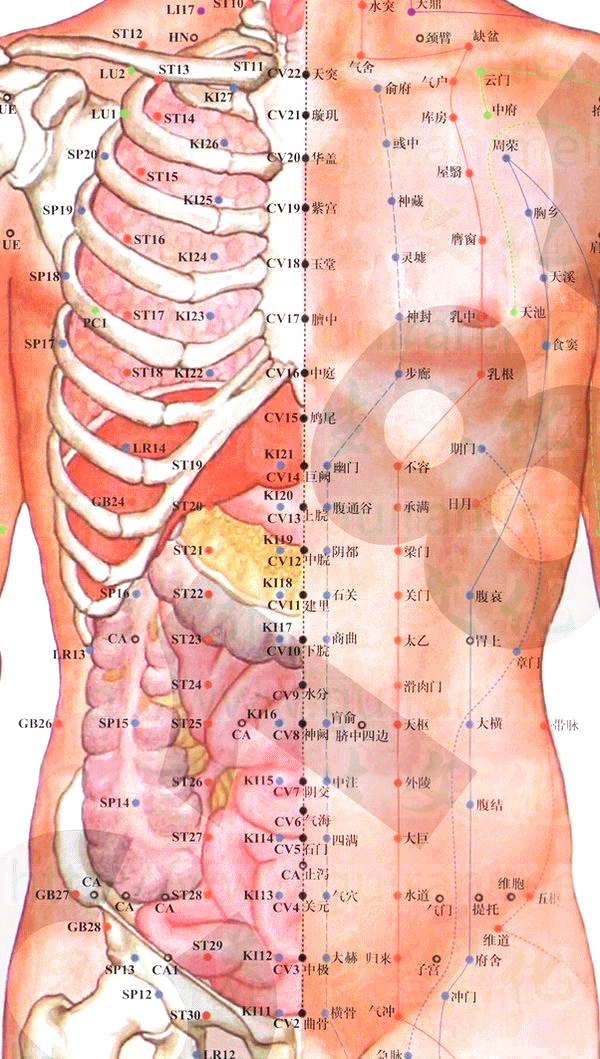 配幽门穴治烦心呕吐,胸脘满胀。