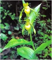 ###绿花杓兰,陆生植物,高30-60cm。茎被棕色短柔毛,具4-5枚茎生叶。叶椭圆形或卵状披针形,长10-18cm,宽约6-8cm,渐尖,边缘具细缘毛。总状花序具2-3朵花,每花有1枚叶状苞片;花苞片卵状披针形;花绿黄色,直径约7cm;中萼片卵状披针形,长3.5-4.5cm,宽约1.5cm,具尾状渐尖;合萼片近似中萼片,常较短,先端2裂;花瓣条状披针形,几与萼片等长,宽约6mm,背面中脉具毛;唇瓣长约6cm,为花瓣长的2/3;绿黄色而多少具紫色条纹,囊内基部具长柔毛;退化雄蕊近圆形,长约7mm,急尖,基部收狭成2-3mm的柄,下面具龙骨状突起;子房条形,密被白色短柔毛。花期4-6月。
