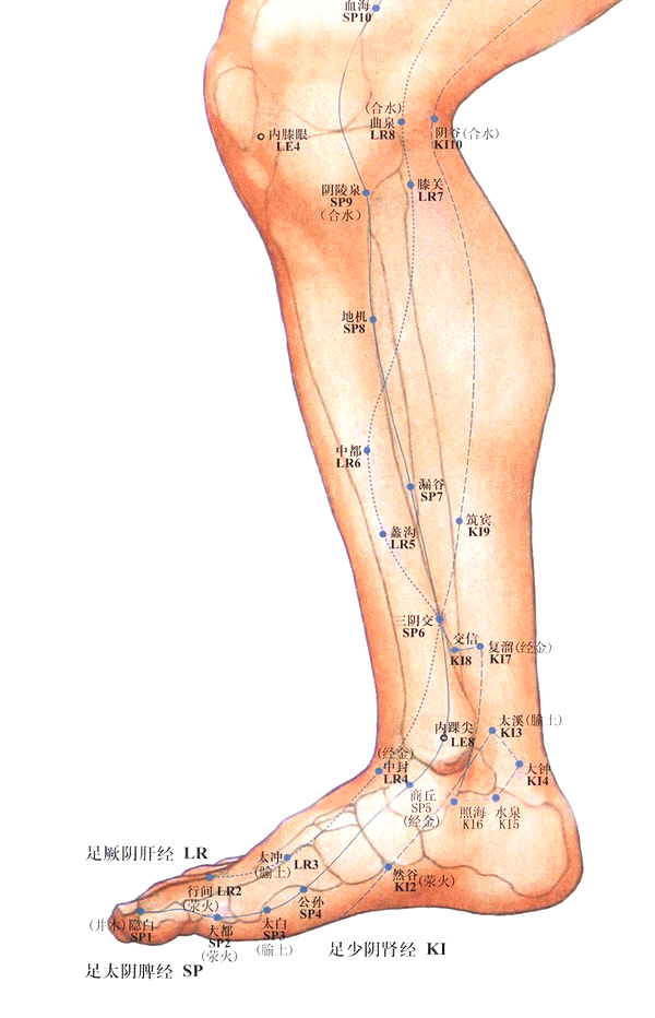 《针灸甲乙经》:女子疝瘕,按之如以汤沃其股内至膝,飧泄,灸刺曲泉。少腹肿,阴挺出,痛经水来下,阴中肿或痒,漉青汁若葵羹,血闭无子,不嗜食,曲泉主之。